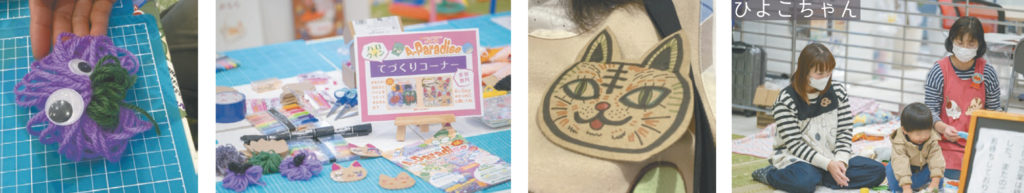 キッズスペースでは、ハロウィンカラーの「毛糸のお花&モンスター」、段ボール製の「ネコバッジ」(監修:Lilybell)をつくれる手作りコーナーもあり、子どももおとなも、色とりどりに仕上げていました。 「見守りサポーター」として保育サポーターひよこちゃんのみなさん。おもちゃで遊ぶお子さんを見守ったり、複数人のお子さんを連れた方のサポートしたりしていただきました。