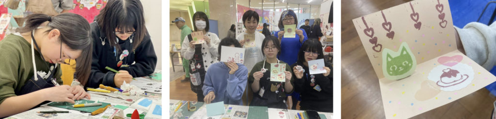 ねこやケーキなど、かわいらしいモチーフをいくつか選んで、カッターや彫刻刀で消しゴムをほりほりして、ぺたん!路子先生に仕組みを教わって、飛び出すメッセージカードを作ることができました。