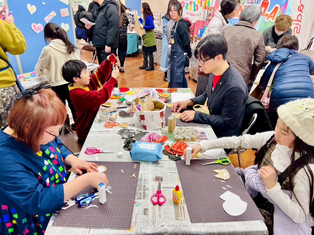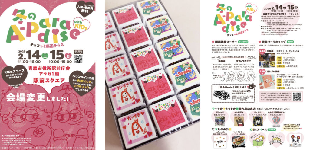去る2/14(土)と2/15(日)の2日間、「冬のA-Paradise〜チョコっと版画テラス〜」と題し、紙版画はじめ、いろいろな創作を楽しみながら、フード・ドリンク、お買い物を楽しめる空間をオープンしました。会場には、お子さんからおとなの方までたくさんの方に来ていただき、それぞれ作ったり、一緒に作ったり、楽しく和やかな時間が流れていました。今回は、高校生や「あおもり子ども劇場」ボランティアさんも大活躍!