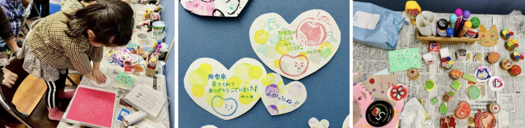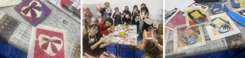 カラーの小さい木版画を作ってみよう、ということで、事前にお申し込みいただいたみなさんが有佳子先生に教えてもらいました。ハート、りぼん、音符、スイーツなど、思い思いの作品ができあがりました。